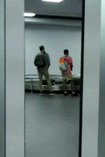 Two friends await in the airport for a third friend to arrive. As the other passangers pass by, pictures not taken accompany their conversation.