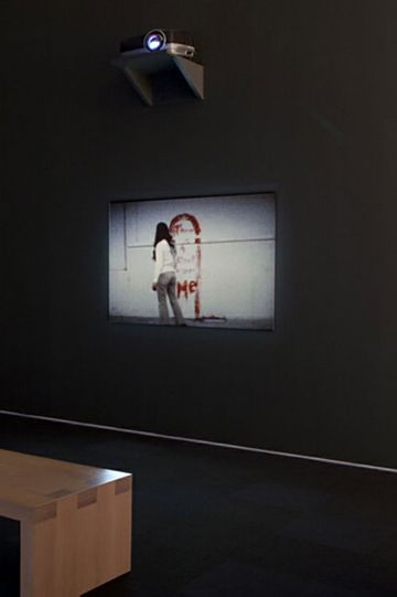 A single-channel video (transferred from Super-8 film), color, silent, where we watch the artist from behind as she traces a rough outline of her body in blood against a white wall.