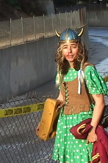 A woman with a viking helmet bloody nose and large wheel of cheese rambles across Los Angeles followed by a cameraman hoping to catch some action