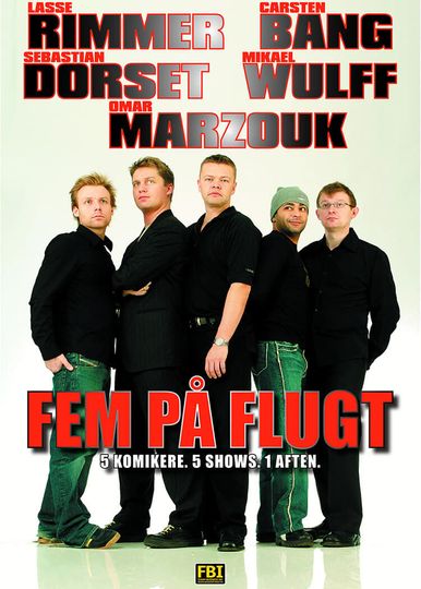 Five Danish stand-up comedians fled the country in the spring of 2003. Their escape took them through 20 Danish cities, where they performed 29 shows for more than 16,000 audience members. On Saturday, April 5, Magasinet in Odense hosted the show with Carsten Bang, Lasse Rimmer, Omar Marzouk, Mikael Wulff, and Sebastian Dørset. That same evening, the show was recorded on video. A short time later, it was released. And in just a moment, you will be able to purchase it. Then you can watch it again and again and perhaps call your friends and say, "Come and watch 'Fem På Flugt' with me," and while you wait for them to arrive, you can watch it again before you all watch it together. And afterwards, you can enjoy watching it again. Or maybe just enjoy a game of Yahtzee and a good Swedish sausage stew. It's up to you, really. Anyway, buy this show. Come on. Be nice.