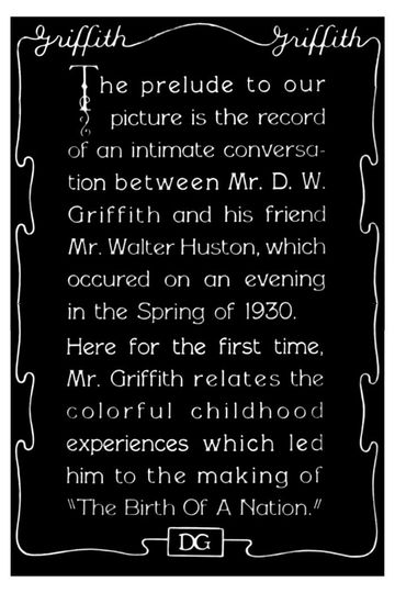The prelude to our picture is the record of an intimate conversation between Mr. D. W. Griffith and his friend Mr. Walter Huston, which occured on an evening in the Spring of 1930. Here for the first time, Mr. Griffith relates the colorful childhood experiences which led him to the making of "The Birth of a Nation."