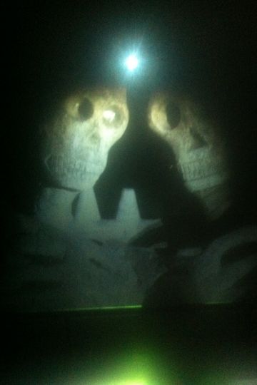 This film depicts Bunleua Sulilat’s temple/sculpture garden 'Sala Keoku', located in northern Thailand. Passages of blackness sporadically dissolve under the fitful internal illumination of sparklers, which light up to reveal Sulilat’s unorthodox temple populated with a fantastical concrete menagerie of beasts and figures; the sculptures range from the broad, whale-like contours of a frog’s face, to a cavalcade of dogs on mopeds, to a pair of skeletons partially embracing as if sitting for a double portrait. These images are interspersed with those of an older Thai couple mysteriously wandering around the temple like wraiths, the woman’s plodding progress hampered by the use of crutches.