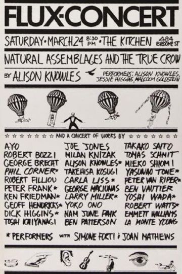 On March 24, 1979, The Kitchen presented a two-part program dedicated to the work of various Fluxus artists. The programming began with the premiere of Alison Knowles’s “Natural Assemblages and the True Crow.” For the piece, Knowles engaged in a dialogue with her own taped voice, which read aloud selections from various natural history books. Simultaneously, violinist Michael Goldstein provided an improvised score while dancer Jessie Higgins executed a number of one-movement phrases by following instructions on index cards. The second part of the night’s programming consisted of forty rapid performances—most sixty seconds or less—by various Fluxus members, including Yoko Ono, George Brecht, La Monte Young, and Nam June Paik. Ken Friedman and Larry Miller coordinated this portion of the event.