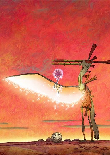 A barren desert filled with deep red and orange. A bird-like creature runs across the terrain in an awkward, primitive way. It looks hungry.