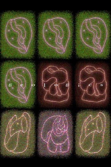 An exploration of phenomena through the glyphic constitutions of geography. Pictorializing the growths and formations of earthly "bodies" (land, life, technology, language) using humanity's most elemental symbols of communication. A voice, satellite-like in its disembodiment, articulates its stream of consciousness or lack thereof; its monologue meanders and overlaps, leaving viewers space to interpret the visual material of the colorful runic terrain. The ontological map is thus instantiated.