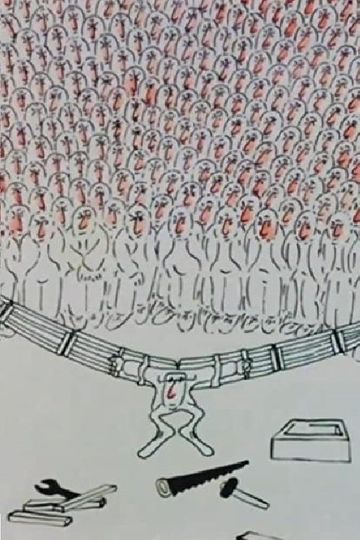 A man constructs wooden wings enabling him to fly, but he is bounded by the giant wire cage encircling both the fliers and non-fliers.