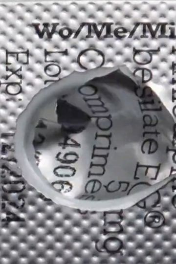 The work is constructed from shots of tidal seawater running over rippled sand and the blister pack for Amlodipine, a blood-pressure reducing drug.