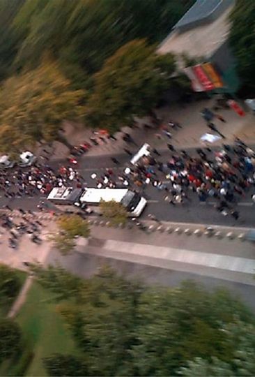 This is a large projection of aerial footage that has been shot by pigeons equipped with lightweight digital cameras With heavy wind and the nervous flapping of wings the viewer gets only a fractured impression though immediately identifiable of a political demonstration