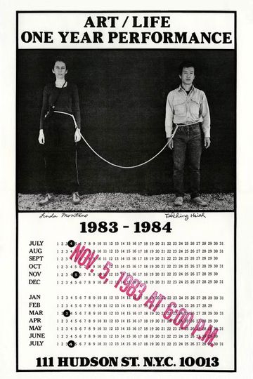 From 6 P.M. on July 4, 1983, until 6 P.M. on July 4, 1984, Tehching Hsieh and Linda Montano were tied together continuously with an 8-foot rope which passed loosely around their waists and was sealed at each end. Their intention was not to touch each other except accidentally—about 60 brush-bys and one brief hug by Montano occurred during the year. They slept in separate beds a few feet apart. When one showered, the other waited outside the door, but aside from this they were never in separate rooms. Both remained celibate for the duration. This film was shot on black-and-white super 8mm. [Overview courtesy of Artforum]