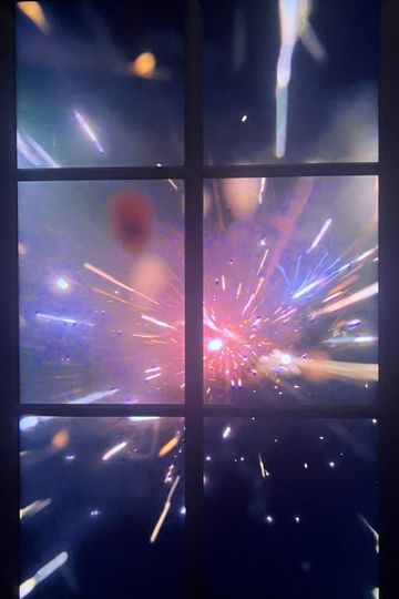Life and fireworks seen through a window.