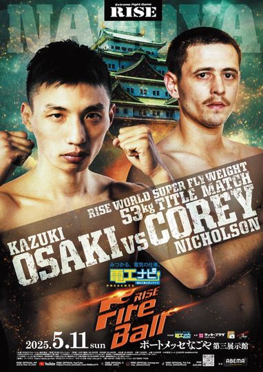 RISE FireBall NAGOYA took place on May 11, 2025, at Port Messe Nagoya Third Exhibition Hall in Nagoya, Japan. This kickboxing showcase, sponsored by Denko Navi, features Koki Osaki facing Keisuke Monguchi in a -55kg SuperFight as the main event. The co-main event pits Erina Shimizu against Mei Miyamoto in the RISE QUEEN Mini Flyweight (-49kg) title bout. Other fighters include Kazuki Osaki vs. TBA, Seiki Takahashi vs. Kanchan, and Ryoto Takeda vs. Facundo Gramajo across the card. Doors open at 14:00, with the action starting at 15:00. It’s a standout night for RISE in 2025, broadcast live on ABEMA.