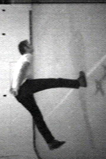 A fixed camera turned on its side records Nauman repeating for nearly an hour a laborious sequence of body movements inspired by passages in works by Samuel Beckett that describe similarly repetitive and meaningless activities Hands clasped behind his back he kicks one leg up at a right angle to his body pivots fortyfive degrees falls forward hard with a thumping noise extends the rear leg again at a right angle behind and begins the sequence again As in many of his fixedcamera film and video works parts of Naumans body disappear from the frame as he moves close to the camera occasionally he walks offscreen completely while the sound of his footsteps continues on the sound tracks