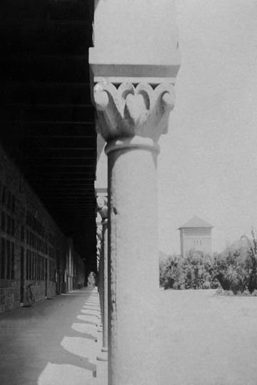 People walking around the campus The view shows an immense arch in the background through which are seen coming groups of students some walking others on bicycles The ivy covered walls of the building form the background to a pleasing picture