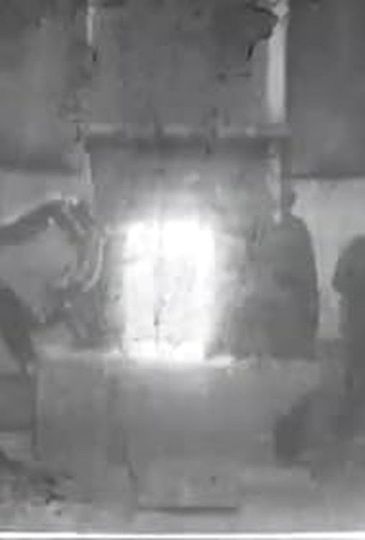 From what appears to be a furnace, a large, glowing block is lifted with the help of a crane over to a table by a group of men. A hammer comes from above and pounds down on the block repeatedly as the men turn the block several times so that it will acquire a certain shape.
