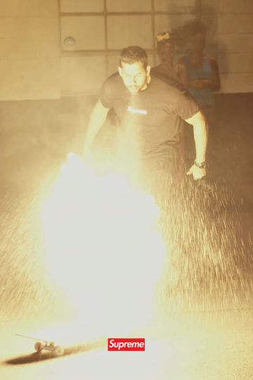Mark Gonzales, David Blaine and a skateboard engulfed in flames. Publicity spot for Supreme.