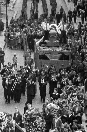 Stefan Jaracz, expecting his death, wrote a letter to his fellow artists. Quotations from this ideological testament and excerpts from a pre-war film titled “Jego wielka miłość” accompany the shots of the famous actor's funeral in 1945.