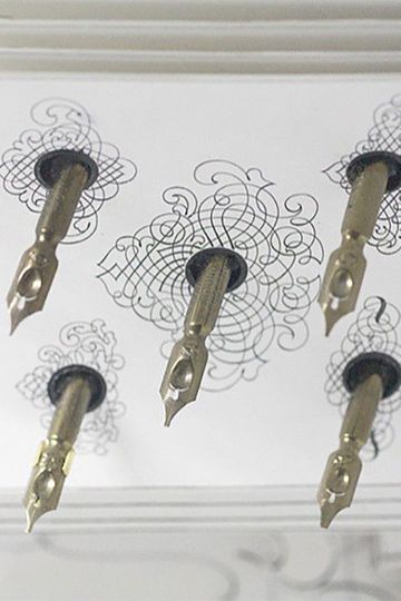 With harpsichord music in the background, a dandy, seated at a table, plucks a quill pen from a ceiling full of them above him, dips it in ink, thinks, then draws a straight line down the page in front of him, out of which sprout six more quill pens, each held by a hand. The calligrapher moves all the hands and pens in unison, drawing an elaborate feathered wing, which comes to live, peeling off the page, and, now a quill pen, slips in to his hand. He tucks it behind his left ear.