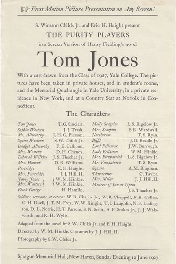 The first student film made at Yale, and one of the earliest student feature films ever made, this adaptation of Henry Fielding's novel was made in the spring of 1927 by a filmmaking collective called the Purity Players, led by S. W. Childs, Jr.