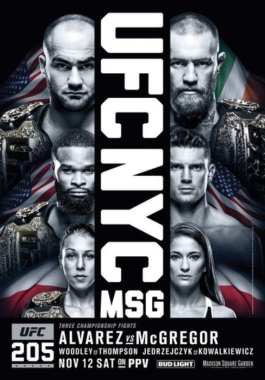 UFC 205: Alvarez vs. McGregor is a mixed martial arts event promoted by the Ultimate Fighting Championship held on November 12, 2016 at Madison Square Garden in New York City, New York. This event was the first UFC event hosted in New York City. It was also the first UFC event hosted in the state of New York after the longtime professional MMA ban was revoked in early 2016. The event was headlined by a UFC Lightweight Championship bout between then champion Eddie Alvarez and UFC Featherweight Champion Conor McGregor.