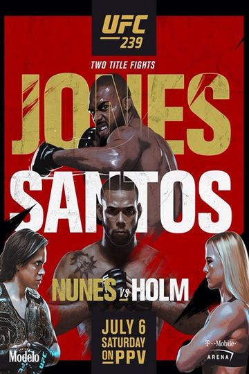 UFC 239 Jones vs Santos was a mixed martial arts event produced by the Ultimate Fighting Championship that was held on July 6 2019 at TMobile Arena in Paradise Nevada A UFC Light Heavyweight Championship bout between current twotime champion Jon Jones and Thiago Santos served as the event headliner A UFC Womens Bantamweight Championship bout between the current champion Amanda Nunes also current UFC Womens Featherweight Champion and former champion Holly Holm served as the event coheadliner