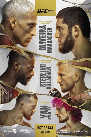 UFC 280: Oliveira vs. Makhachev was a mixed martial arts event produced by the Ultimate Fighting Championship that took place on October 22, 2022, at the Etihad Arena in Abu Dhabi, United Arab Emirates. A UFC Lightweight Championship bout for the vacant title between former champion Charles Oliveira and Islam Makhachev headlined the event. Oliveira was stripped of the title at UFC 274 when he failed to make weight for his attempted title defense against former interim champion (also former WSOF Lightweight Champion) Justin Gaethje.