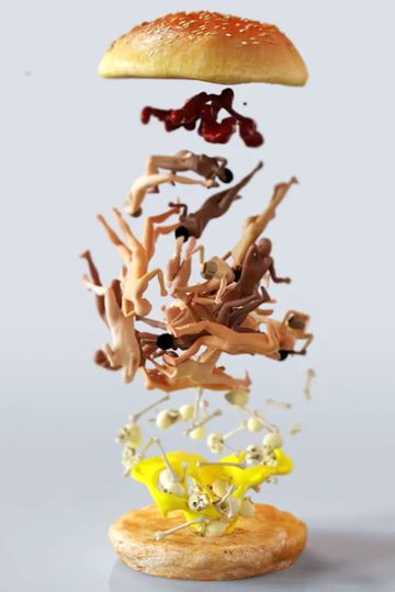 In this hyper-realistic digitally rendered video, sandwiches are assembled in sequence. Each component, from the first slice of bread to the last, is dropped dramatically from a height, before bouncing and settling into place in slow motion. Mayonnaise, then ham, lettuce, tomato, cucumber, and the final slice on top. This perfect yet uncanny choreography reads like an exaggerated, perverse take on ‘food-porn’ obsessed advertising campaigns. These sequences repeat, the sound gradually incorporates saws and machinery, echos from empty environments, pianos breaking, smashes, crashes and mechanical crescendos like jet engines alongside eerie drones, bells, and hard rummaging noises. Another piece of bread lands, some rubber baby dolls fall onto it, some brown slop, a blanket, denim jeans, some businessmen in suits, and more slop. Ketchup, then a union jack, all encased in the final layer of bread that falls to the top of the pile to the sound of a tolling bell. Infinite continuation, loop.
