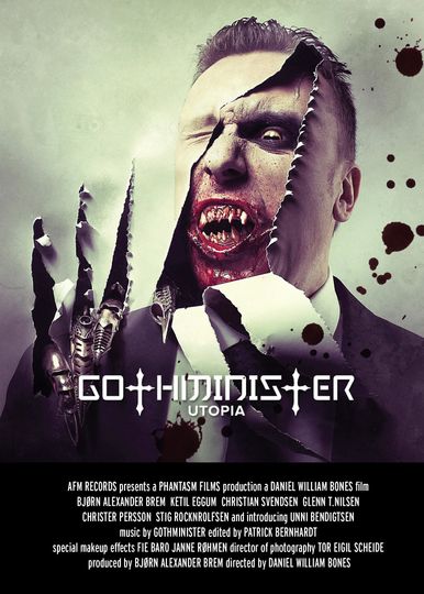 "UTOPIA - One day your darkest fears come to life. But how can you escape your own mind? The concept of UTOPIA is inspired by Bjørn Alexander Brem's life and nightmares - the combination of being a lawyer in daytime and GOTHMINISTER at night drives him eventually insane - it becomes impossible for him to separate reality from imagination. The other GOTHMINISTER members Chris Dead (drummer), Icarus (guitars) and Turbo Natas (guitars) also take part in this nightmarish world filled with undead walkers, witches, werewolves and monsters."